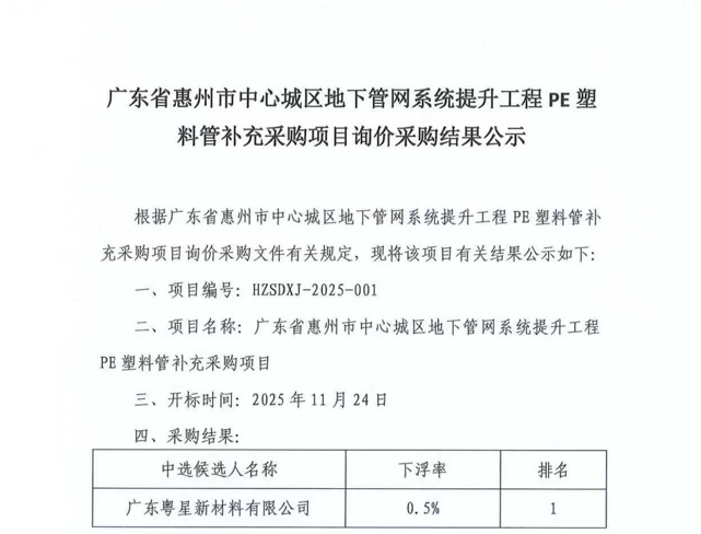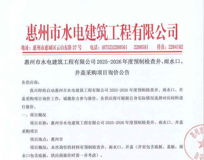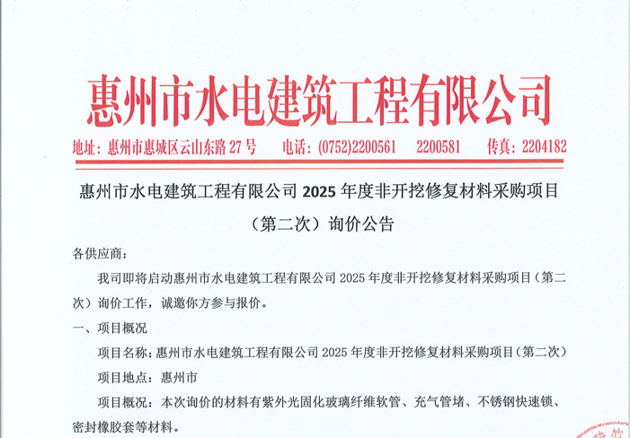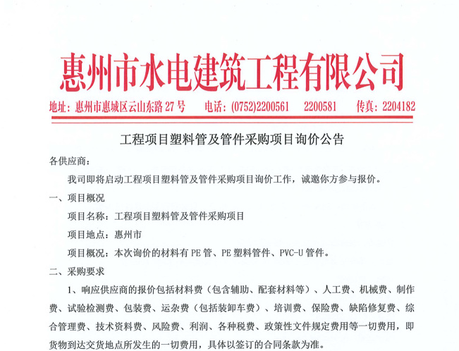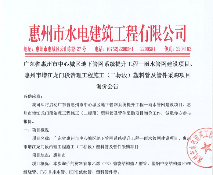 廣東省惠州市中心城區(qū)地下管網(wǎng)系統(tǒng)提升工程—雨水管網(wǎng)建設(shè)項目、惠州市增江龍門段治理工程施工(二標(biāo)段)塑料管及管件采購項目詢價公告……